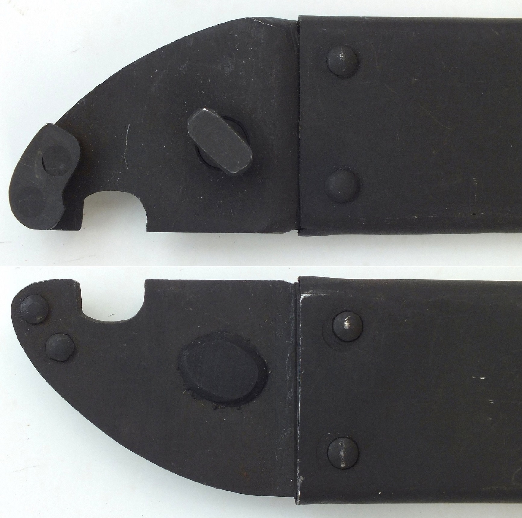 It would also be nice to see the rubber insulator they use on the scabbard as they have the spot welded stop for one. Also would like to see how they attach a belt hanger to the scabbard, as there is no stud or bar. The leather scabbard pictured is possible, but it would rule out use as a wire cutter. Mike