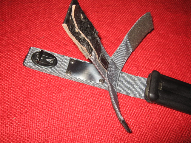 Here are pictures of the unique KM87 scabbard with the permanently attached hanger. The hanger has small and large belt loops plus a signaling mirror. The cutter plate also is different and is shown next to a standard East German Type II scabbard. Note the screw driver tip.