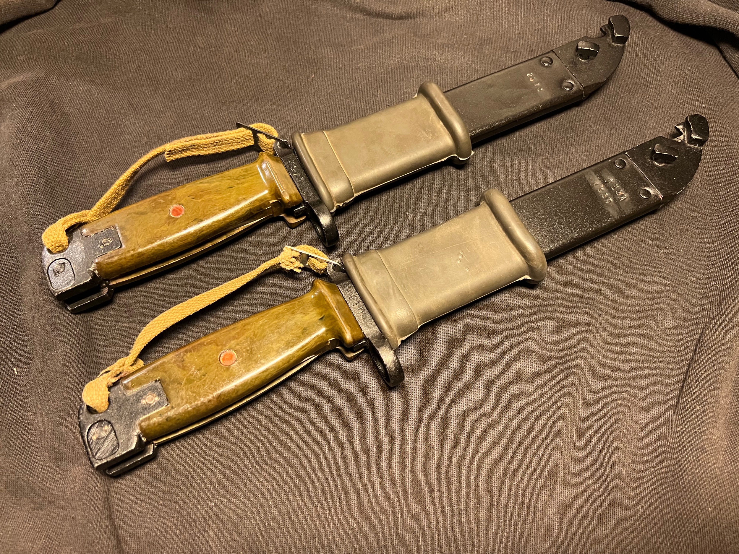 Here are my two current border guard bayonets in all their green glory. Each of em has some interesting details to observe.