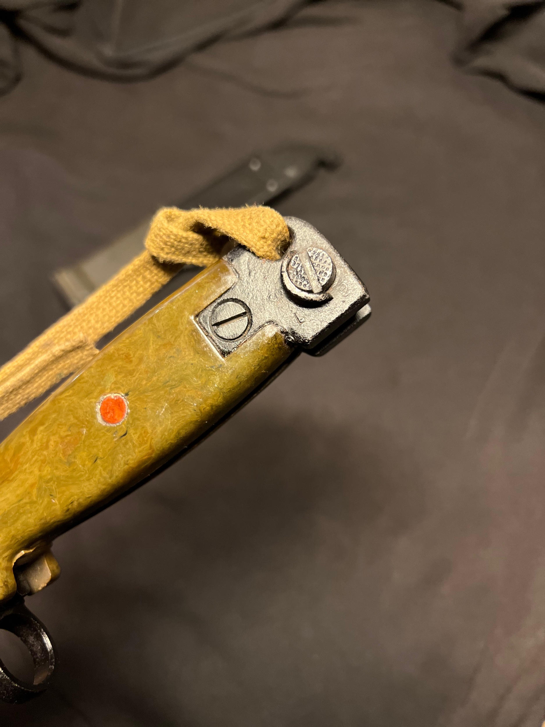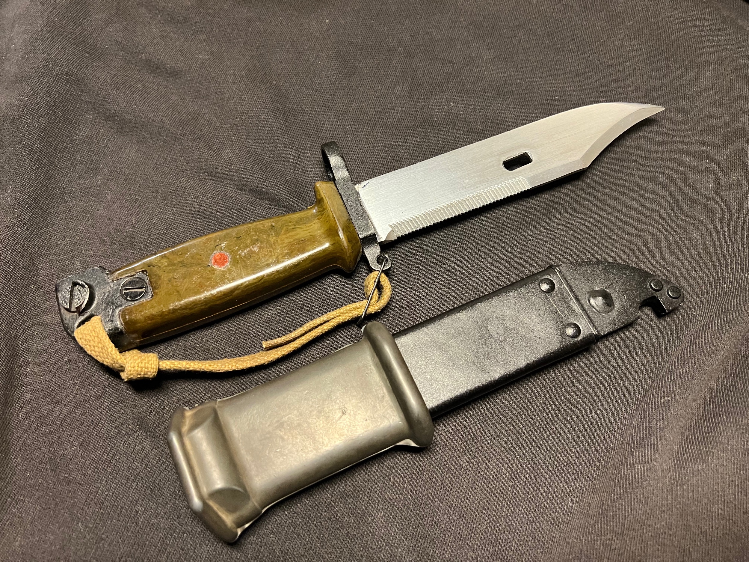 The blade shows sign of some pulling from the scabbard, but is in overall good condition. Im not sure if these scabbards were used before they ended up being paired with the border guard bayonet. The bulging on the scabbard could indicate prior use and the repainting? Im not sure. Or is it from the initial production?