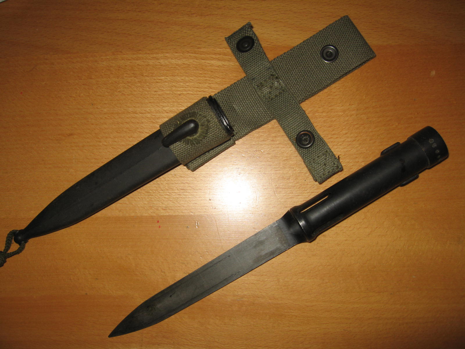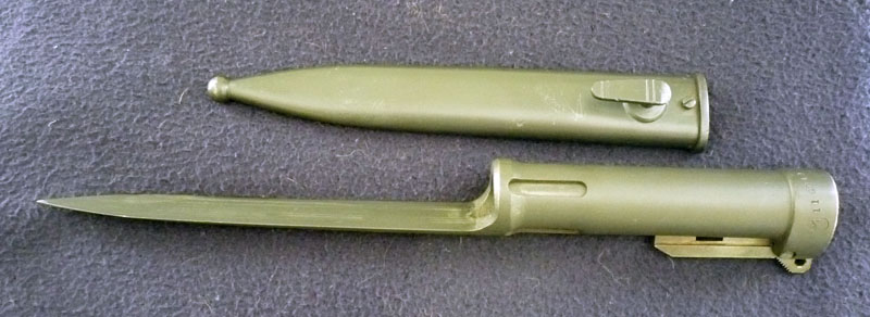 This is a South African R1 bayonet and scabbard. It is for their FN-FAL style weapons. This is the type of bayonet that was modified to fit on the South African Galil/Kalashnikov style R4 rifle. The R4 is featured in Martin Ivie's book "Kalashnikov Bayonets".