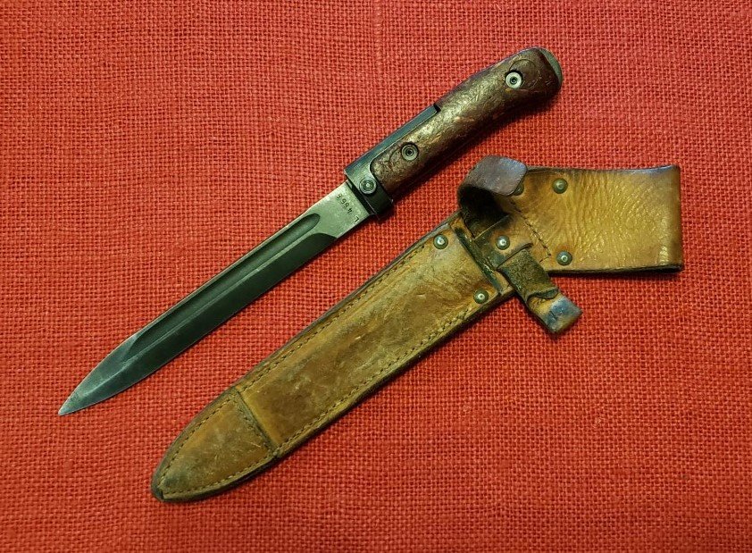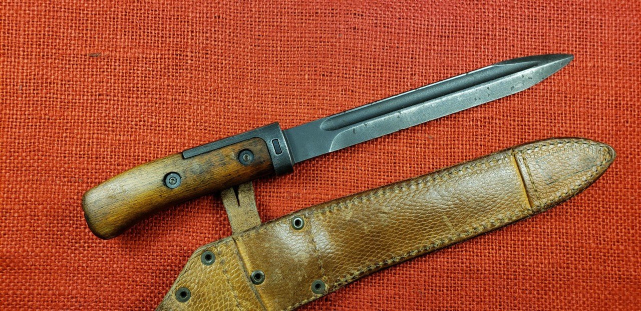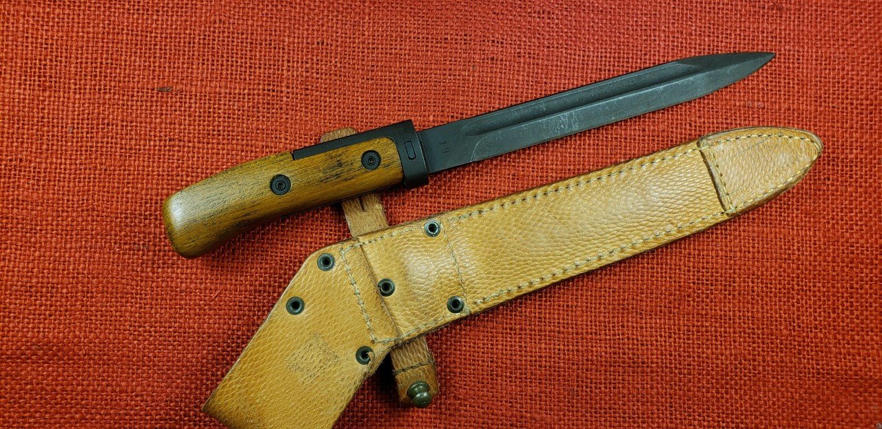 I finally found one on eBay. Received it today. Czechoslovakian VZ58 Type I bayonet and scabbard. This one has the official authorized hilt modification. This was done by removing the original grip panels and welding on a pre-formed tang extension. This was ground smooth and then refinished. New Type III grip panels were then installed and riveted in place using authorized rivets and placement. This one is in decent shape considering it was reworked to start with. This completes my collection / display of VZ58 bayonets and scabbards either standard production or with authorized modifications.