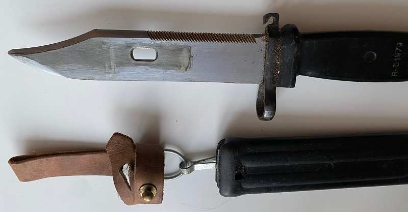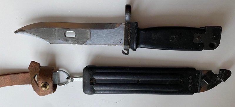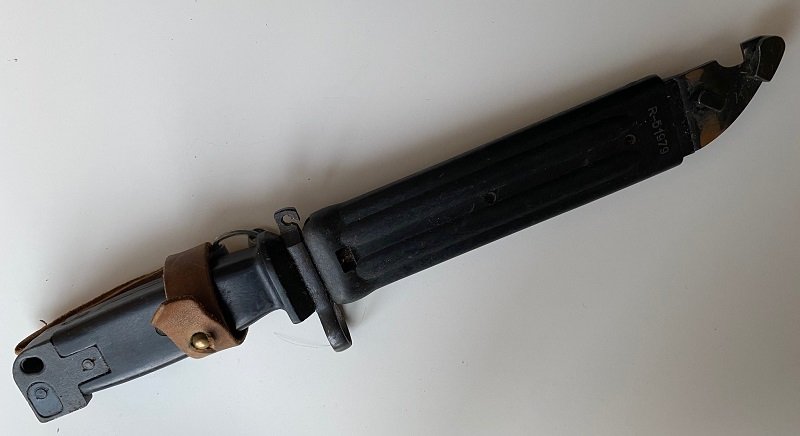 Hi Stefan, This is a Yugoslavian AKM 6X4 Type II bayonet and scabbard. It appears to be in very good used condition with matching numbers and original hanger. This one has the "R" code that is more unusual than the common numbers without the letter. There has been a lot of discussion about the "R" ones. They may indicate a separate production contract or perhaps numbered for Reserve or Replacement issue. Overall a nice matching item, just need a wrist strap to complete it.