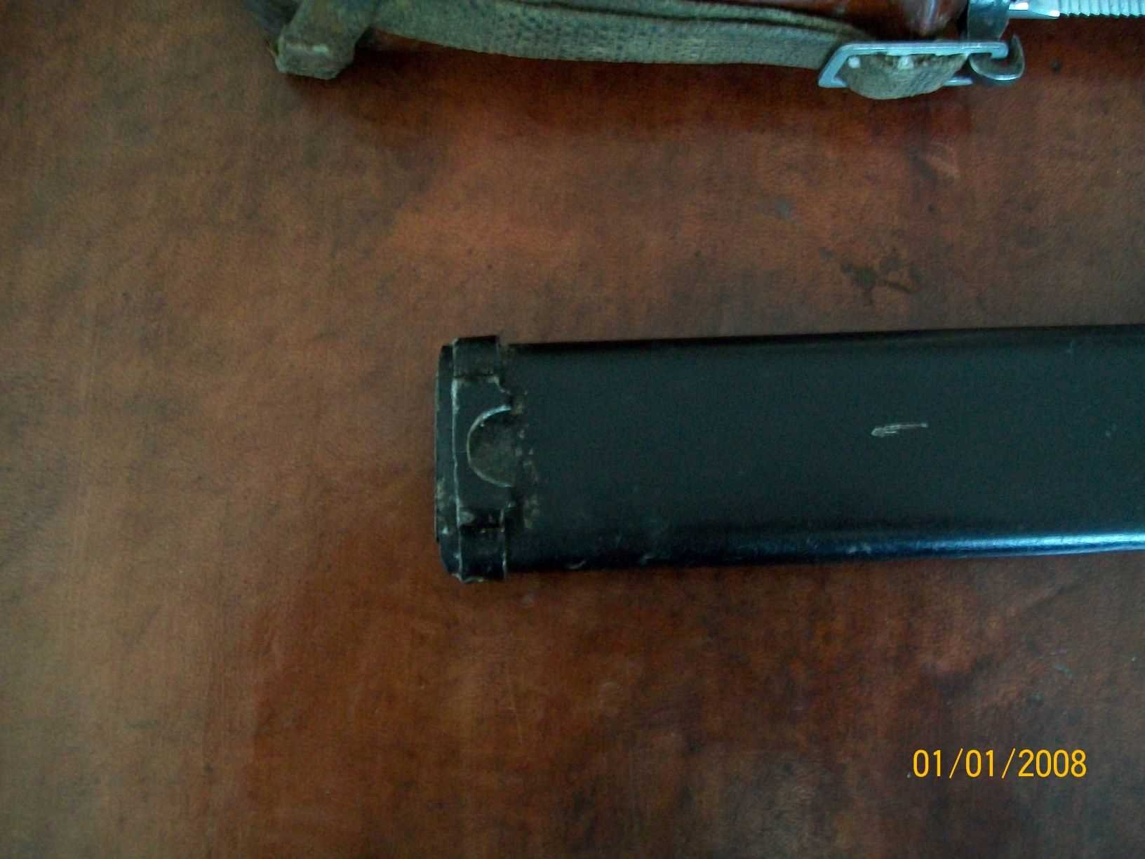 The hanger brackets used on the metal AKM Type I scabbards have followed the designs and methods originated by Russia. Only the very early Russian ones used the flat bar style hanger bracket and they were later reworked to be able to use hangers with a snap hook. This was done by cutting a semi-circular piece from the lower edge of the bar. All later scabbards from Russia and the other countries used the bent wire style. These brackets are all basically the same with only minor variations in forming and installation. For more info and pictures please go to the "Russia" index and topic "Russian AKM 6X3 Type I Scabbard Variations". Scroll all the way through. Mike