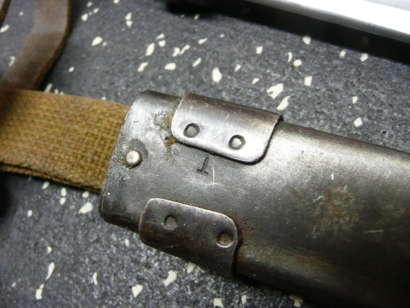 Some other things I think I know. Yes, Tula did use the "T" as an arsenal mark at one time. I have never researched the time periods, But the early 1891 Mosin Nagant rifle bayonets with the locking ring were marked with a bow and arrow for Izhevsk and a stylized "T" for Tula. Closer examination of this "T" would show it was actually a hammer, (Thor's Hammer). At some point in time before the end of WWII Izhevsk switched to the Arrow in Triangle and Tula switched to the Star. This was observed on the later versions of the M-1891 bayonets with the button latches. This was long before the AK47 6X2 scabbards or bayonets were designed or made. Both of the scabbards pictured below do show signs of being reworked. The areas at the top of the scabbards around the tensioner retaining rivets show evidence of grinding. This indicates that the original rivets and tensioners may have been removed for maintenance or repair. Could the "T" be an inspection or rework marking? Mike