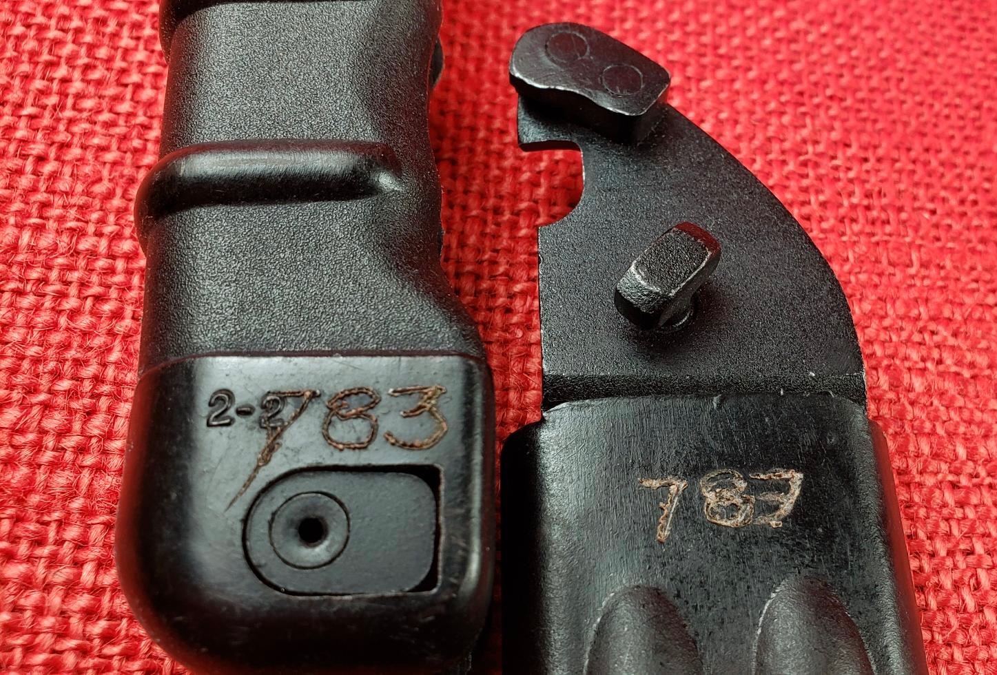 Hi Bas, I am not sure what to tell you. It appears to me to an original, as issued, Russian AK74 6X5 bayonet and scabbard. It is the early first variation with the narrow crossguard. Mine is Plum colored with specks. I can not tell if yours is plum or black from your pictures. I understand about the missing or different markings. Both the bayonet and scabbard should have the raised mold numbers. The inspection and proof marking are usually on the ricasso. I have never seen them on the flat area behind the muzzle ring? The ink stamps are easily removed when cleaning especially with solvents. The hand etched issue numbers indicate it was paired with a weapon.