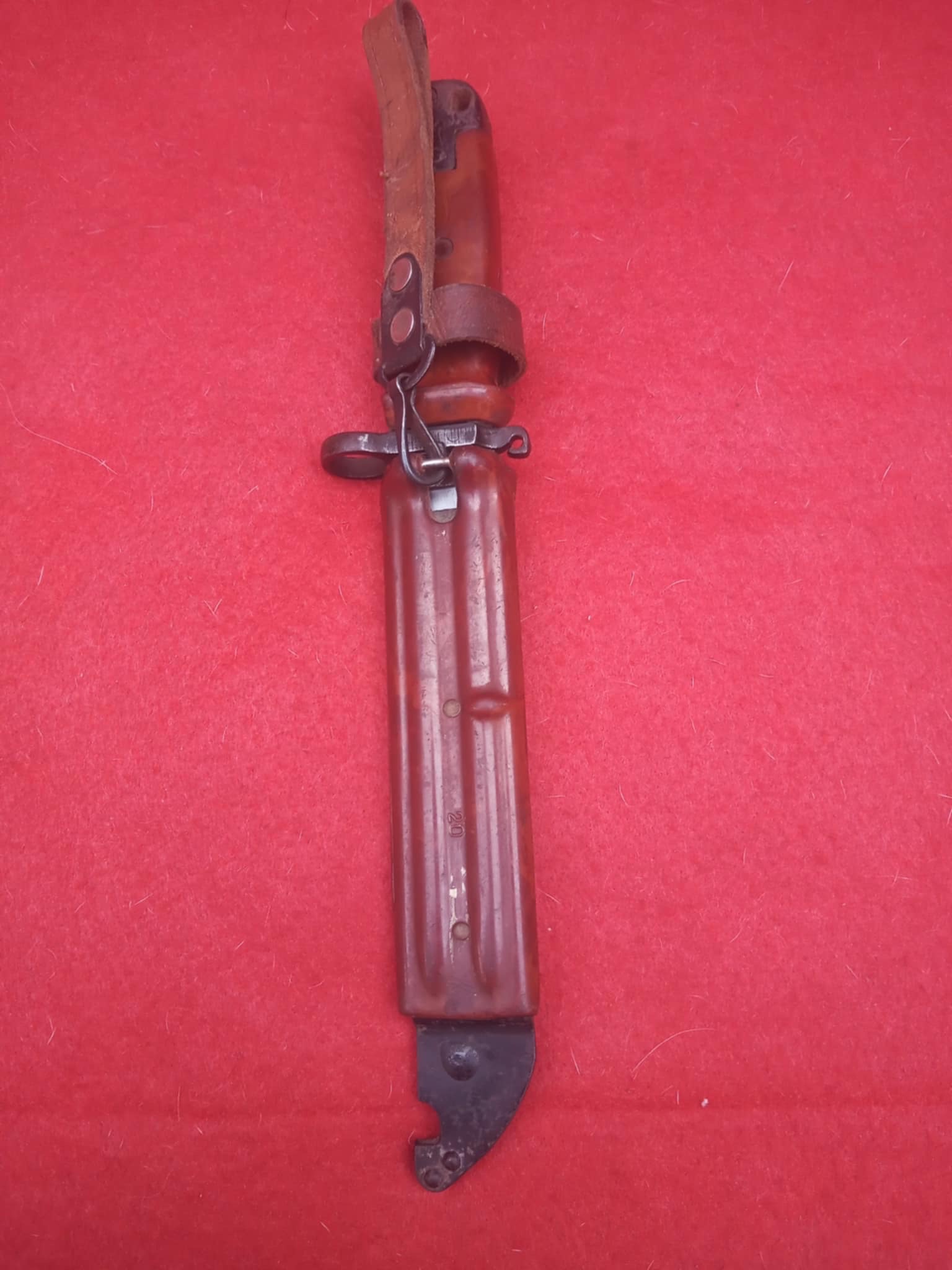 Let’s start over with your bayonet and scabbard. All the other pictures are out of context and of no meaning to me. Your bayonet is a Russian AKM 6X4 Type II early version with the machined pommel and crossguard, (no visible rivets). These were made from 1965- 71. From what I can see it was made at the Tula Arsenal. The original arsenal marks have been stamped over or removed so no confirmation. However, the round rivets on the scabbard cutter plate stop and the off-white paint stamped inspection marks on both the bayonet and scabbard seemed to be from Tula. We can not see if there are original numbers or Russian Military acceptance marks, (OTK or CB or a flattened diamond shape). The style and placement of original numbers and Acceptance marks could tell us if they were made for Russian use of if for a contract with an other country. The matching five digit Eastern Arabic numbers indicate a large number provided or sold to an unknown Arabic country or group. If this was a contract order these numbers could have been placed in Russia or by the new owners. They do seem to be somewhat consistent in style and placement, but use both four and five digits?