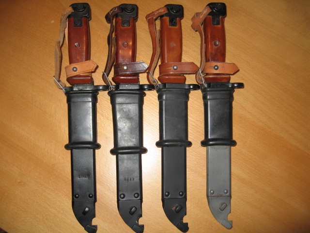 Maybe my eyes are deceiving me, but the rubber scabbard insulator on the left appears longer!? I would be interesting to see the other sides of the bayonets and scabbards. Maybe showing where the insulator stops on the front of the scabbards are located? Mike