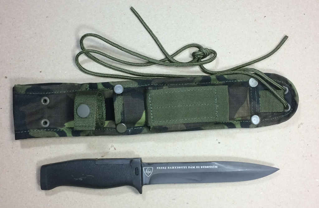 It was made limited edition of 100 pieces from 17029 steel just for members of 121st company with stamped Numbers 001-100 on the right middle side of blade and on the right is laser carved sign of company with their moto "nedej zahynouti nám ni budoucím". Rule was that nobody except members can get the knife so there was certificate paper with number of knife, owners name and signature of company commander (77 were granted). Color of certificate for ordinary soldiers was green while for honorably gifted was red. It was even made gift set of 5 pieces marked H001 - H005. For other units are produced without markings and material was 12020 carbon steel.