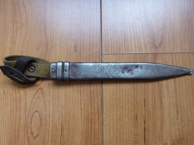 I'm not into trench art or personalized item so did not pay much attention to this post on first look. On second look this scabbard is a real mystery. There has been previous discussion on the flat sided hilt loop studs under "Russia" - "unusal hanger on ak47". The hanger appears to me to be a reworked/replacement item. The scabbard is an early style with the two individual hanger brackets. What's weird is the point of the scabbard. It appears the flat spot welded flanges have been removed and end in an unusual tip. Mike
