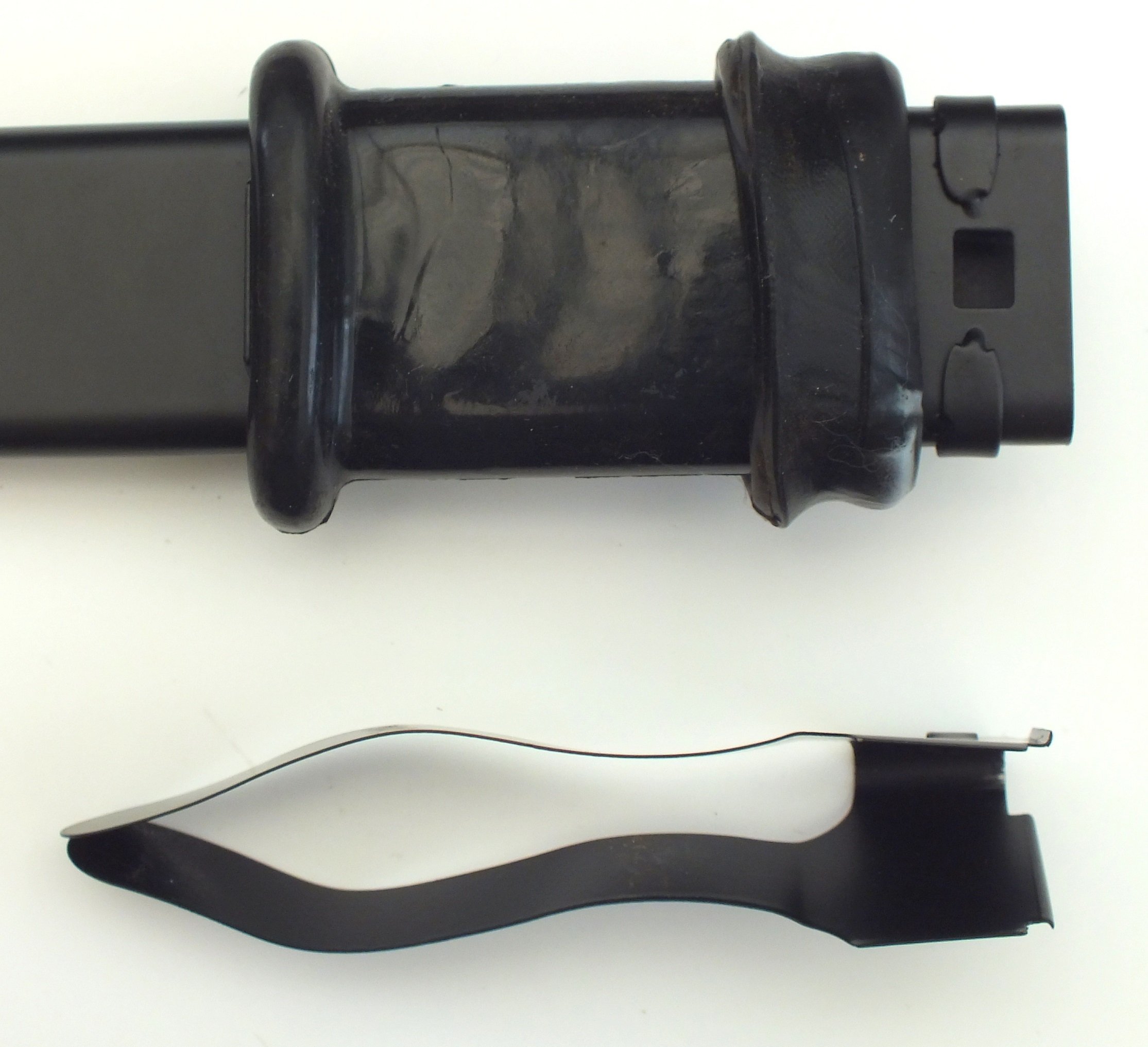 The Scabbard is welded from two sheet metal parts and tapers by 2.0 mm from the top to the shear part. The shear part is without a cleaning hole. The hook eye is very far out.