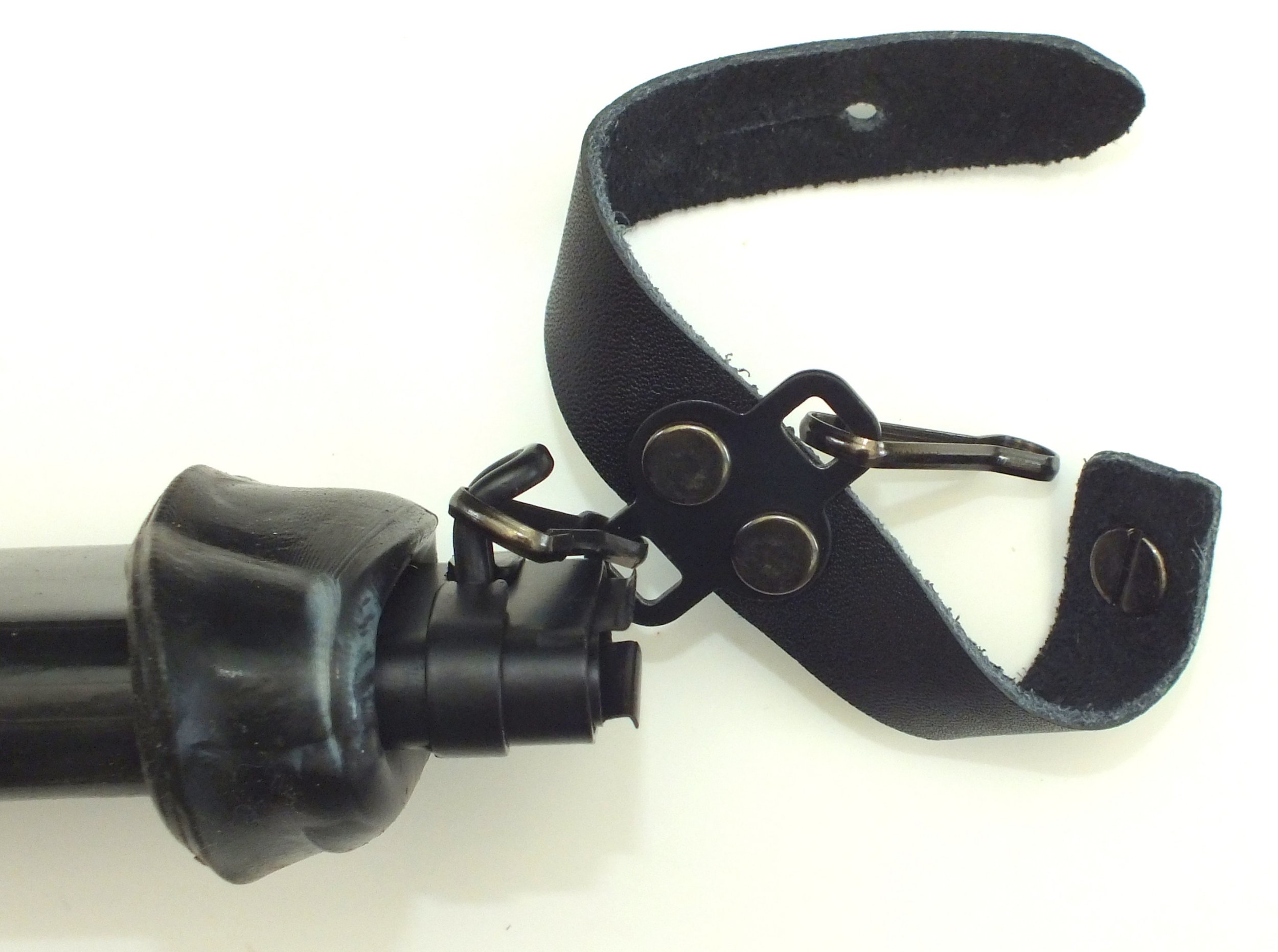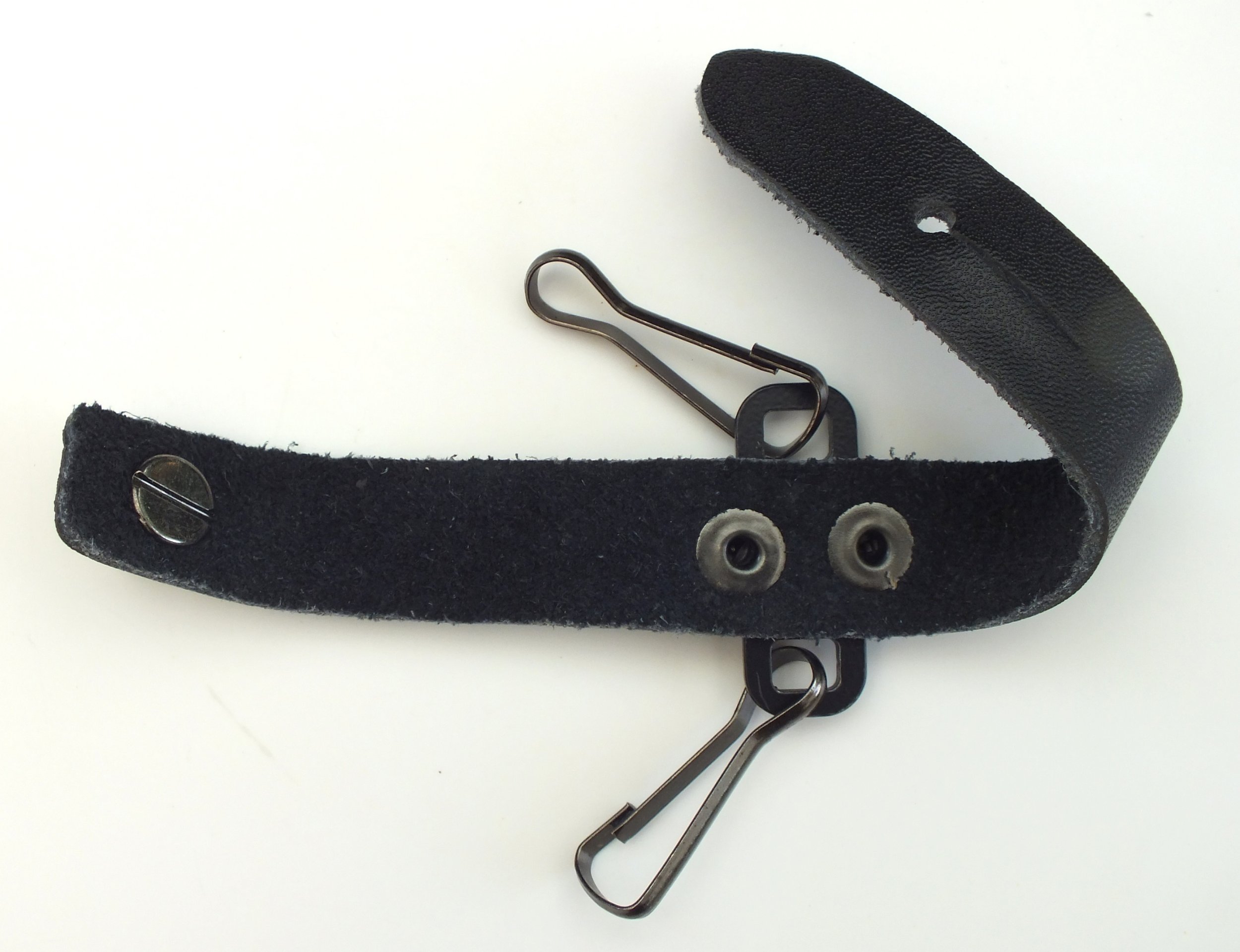 Tragevorrichtung aus dünnen Rindsleder , der Tragehaken aus sehr dünnen Federblech.