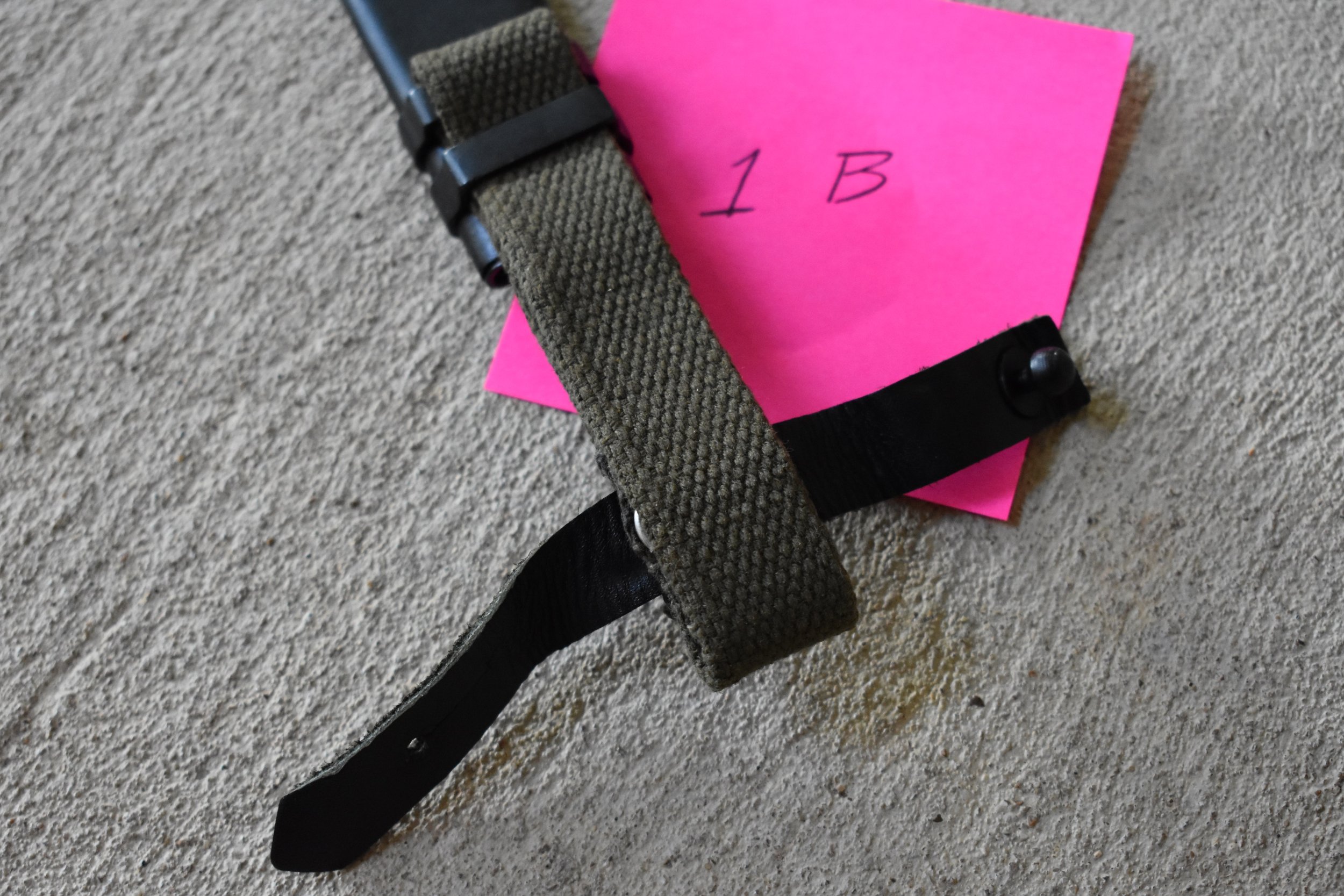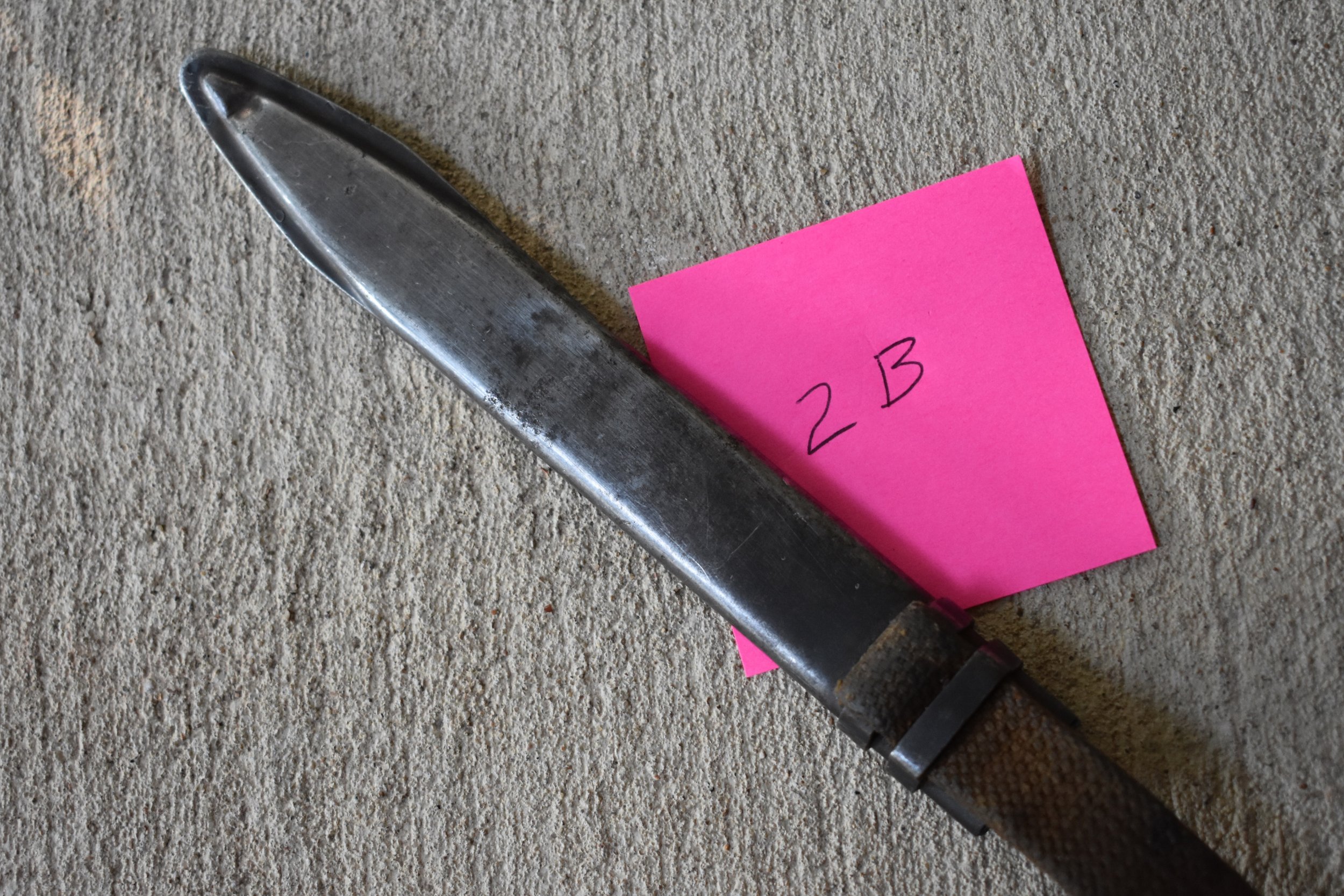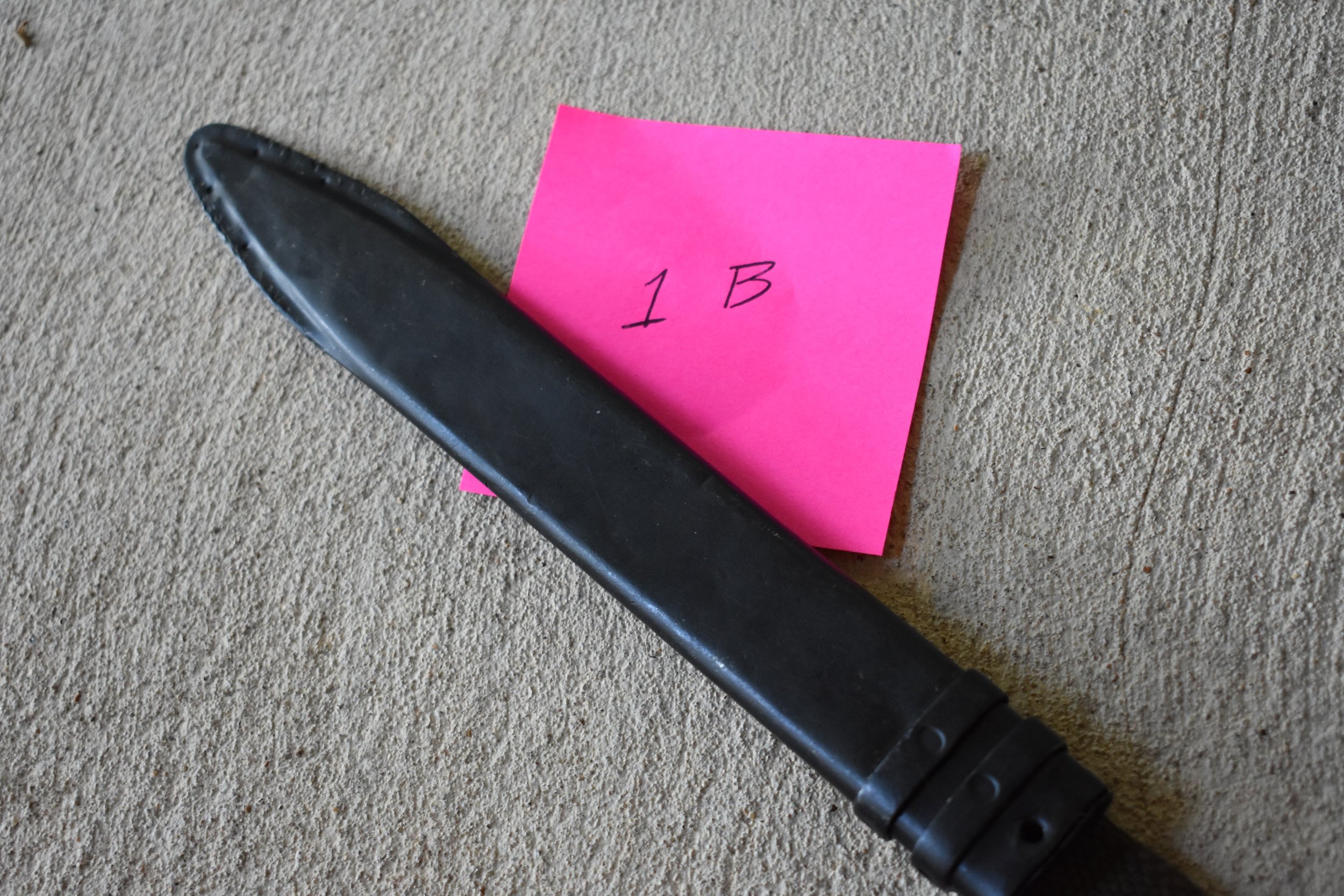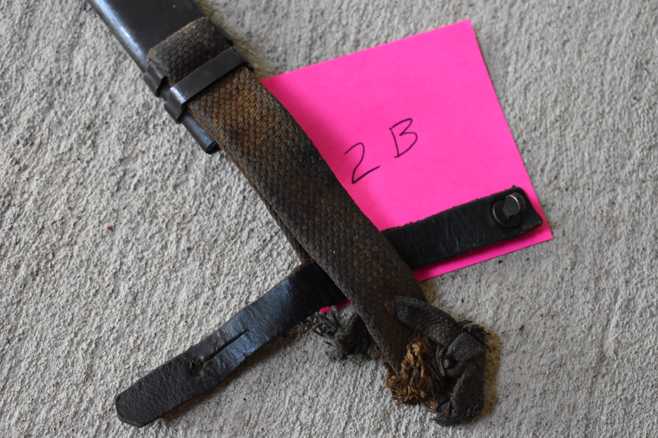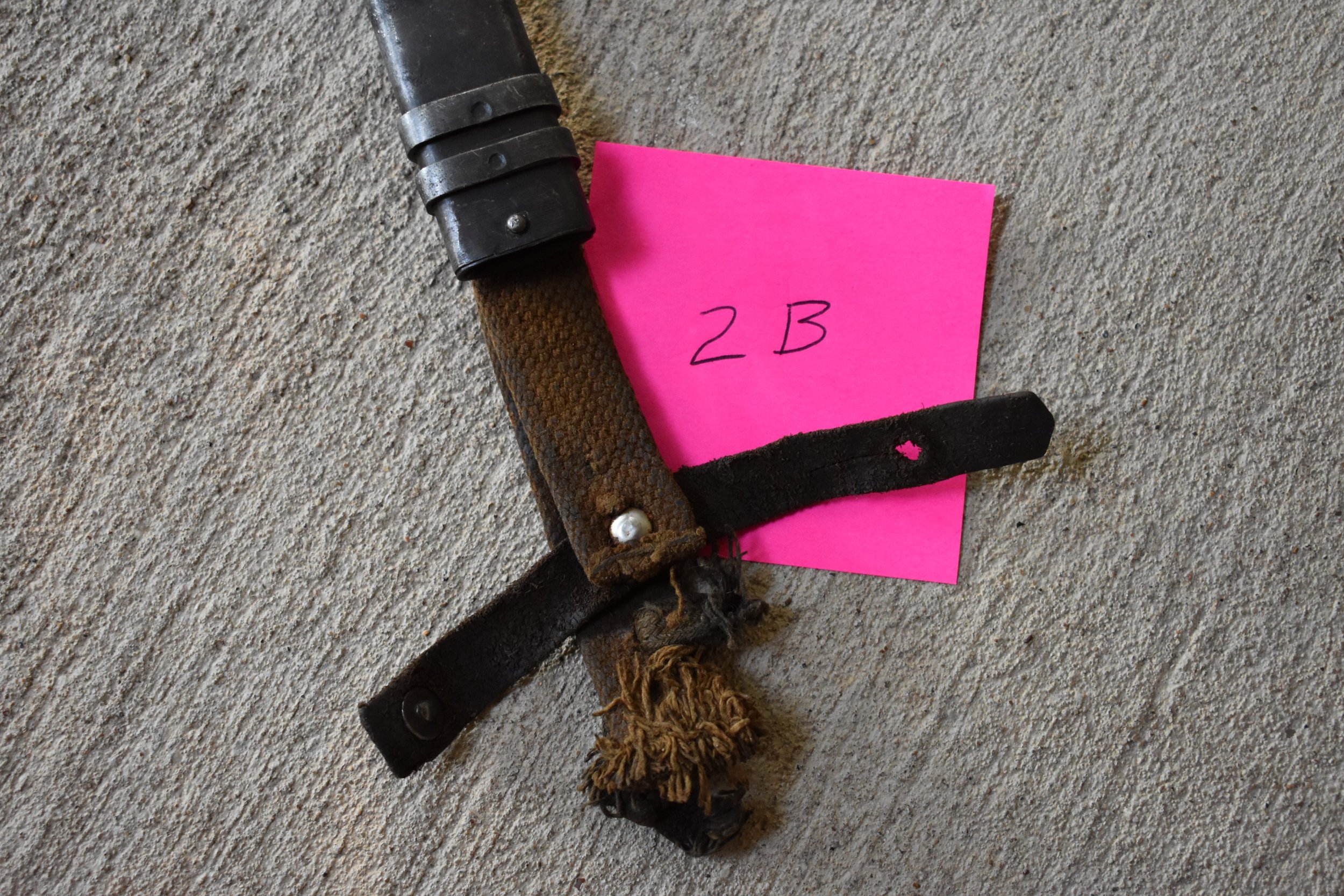 1B is an early two bar Bulgarian scabbard that has been reworked/repaired. The Bulgarian scabbards typically have the drain hole on the back side and two rivets securing the hilt strap to the hanger. This one has had the internal chape rivet drilled out and a replacement style hanger installed.