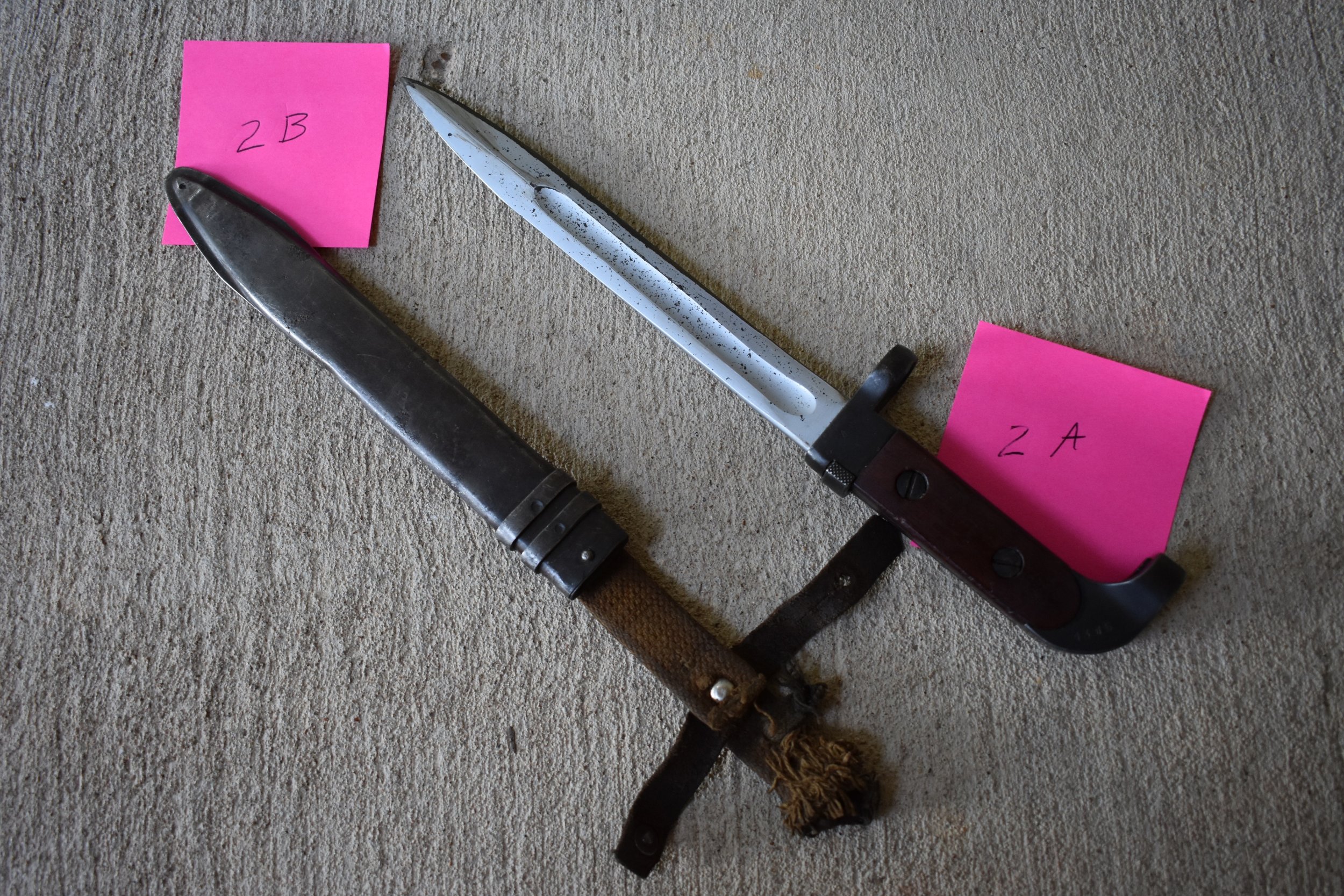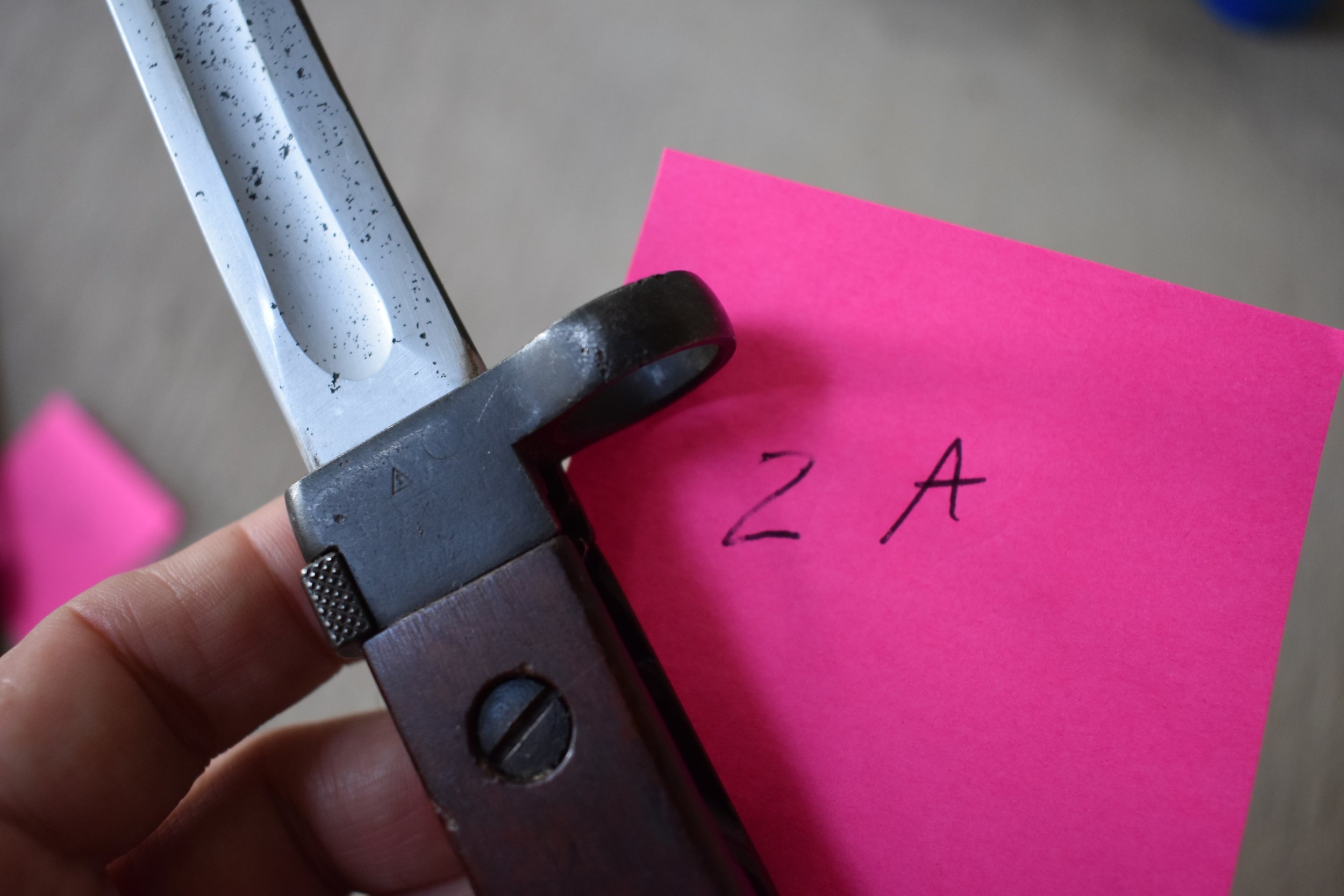 Yes, I had noticed that the grips appeared different on 2A as well. It is possible that some early Russian AK47 bayonets may have used wood grip panels. However this would be quite rare. Also the early Russian bayonets were numbered on the right side of the pommel. I believe from closer inspection that the pictures that the grips on 2A are a molded bakelite material that has been lightly sanded. Below is a picture of a Finnish contract bayonet, (bottom), from my collection with similar grips. Also note the style and placement of the numbers, particularly the "1". Mike