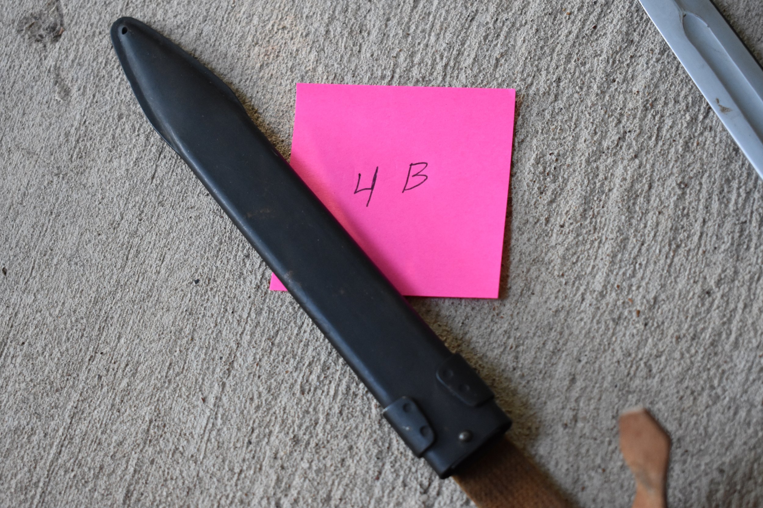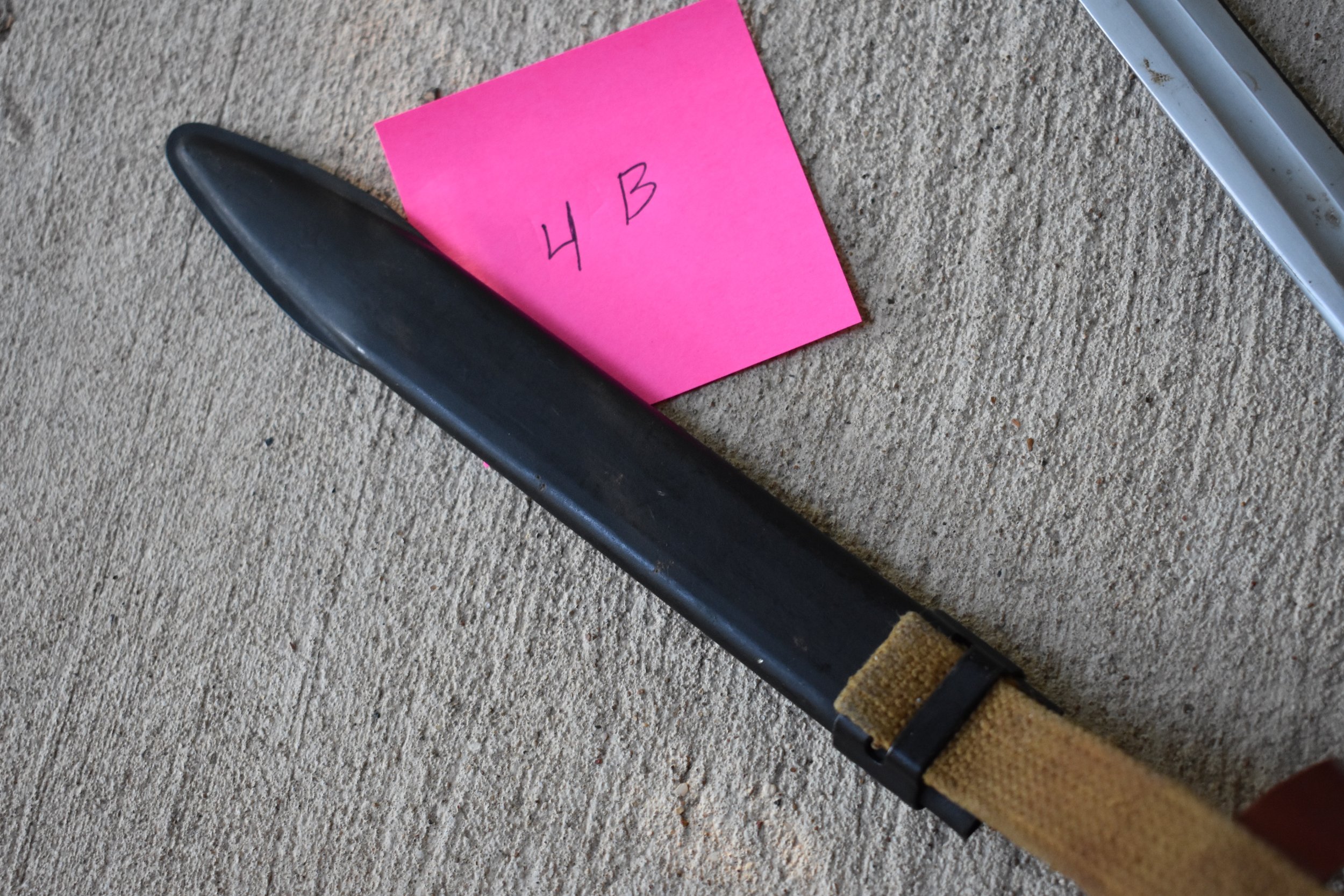The last three, 2B, 3B and 4B are all Russian, but with different variations. 2B is an early 2 bar scabbard. Typically the Russian ones have the drain hole in the front and the hilt strap is secured to the hanger by one rivet. This one also has an unusual flat sided stud on the hilt strap. Unfortunately, the hanger has been badly damaged. 3B is also an early two bar Russian scabbard. Again the drain hole is in the front and a single rivet on the hanger. The all leather hanger may be original, but I believe it is probably a replacement. Usually the original hangers are fabric with a leather or synthetic hilt strap. Nice example of an early scabbard. 4B is a later style Russian scabbard. Drain hole is in front and it has the one piece sheet metal hanger bar. This is a very nice example of an original scabbard. Mike