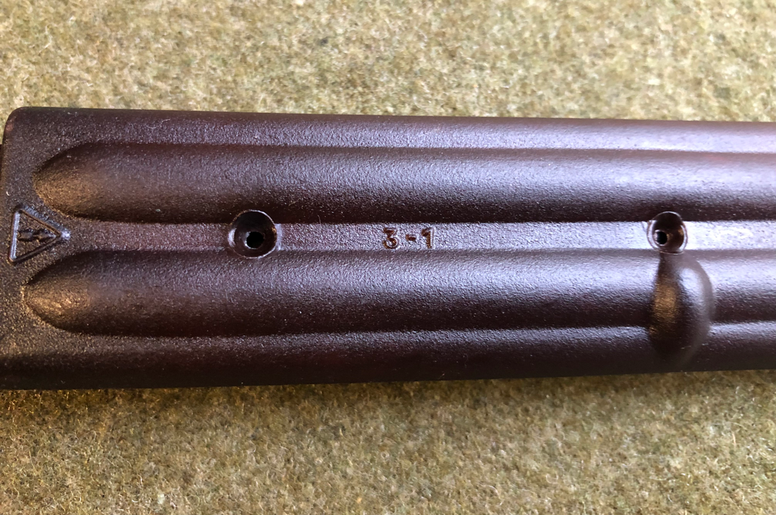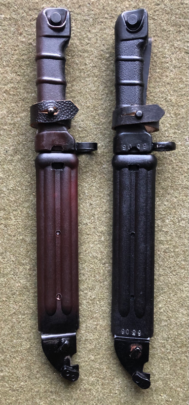 No serial number on the bayonet or scabbard. Black pebble grain leather hanger. Blade marked OTK 51 Opposite side marked 4 within a rectangle Pommel marked 9-1