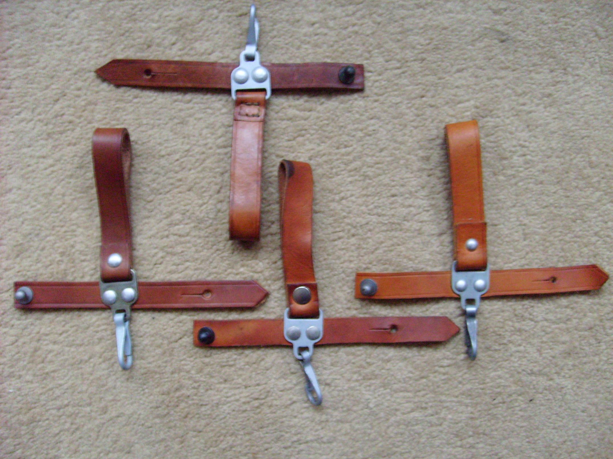 Good pictures! Lot's of different variations in these hangers. Different leather colors, dimensions, rivets, construction and finishes. M.